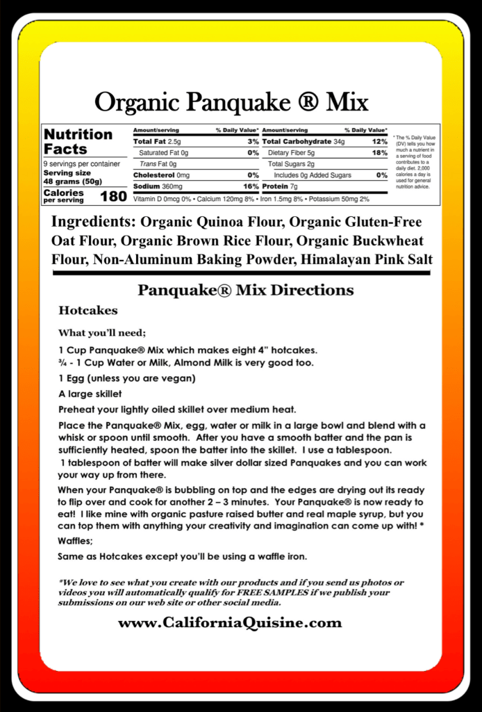 Say hello to Panquake® Mix, our original gluten-free flapjack and waffle mix crafted from organic quinoa. This fluffy, golden mix delivers wholesome, mouthwatering breakfasts that make every morning a treat. Sourced from high up in the Andes Mountains, where quinoa—cherished as chisaya mama, or mother of all grains—has nourished Quechua and Aymara communities for centuries, our ingredients blend sustainability with rich tradition. Quick to prepare and brimming with nutrition, Panquake® Mix is your go-to for tasty meals that support a passion for making kids of all ages healthy and strong. Brighten your day with California Quisine!